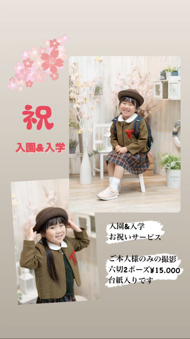 ピカピカのランドセルや入学式用の服、制服姿で記念写真、お子様の晴れ姿や家族写真を残しませんか?